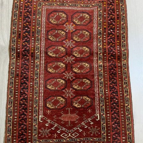 Afghansk håndknyttet orientalsk tæppe i Turkmensk design, uld på bomuld, ca. 95 × 64 cm, midten af det 20. århundrede, brugt. Klik på den blå "gå til varen" knap, for at købe eller byde på denne vare. Den samlede pris vil blive vist inden du afgiver dit bud.