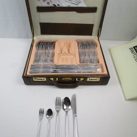 Et forslag fra det belgiske bestiksfirma Eternum i stål til et 63-delt bestiksæt til 9 personer.