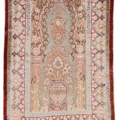 Oprindelsesland Türkiye; model Pure Luxury ~640.000 knuder/m²; tæppe af silke på silke, Hereke signeret tæppe med metal (Souf); dimensioner 93 × 59 cm; midten af 20. århundrede; i meget god stand og professionelt renset. Klik på den blå "gå til varen" knap, for at købe eller byde på denne vare. Den samlede pris vil blive vist inden du afgiver dit bud.