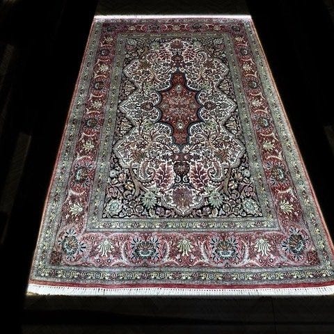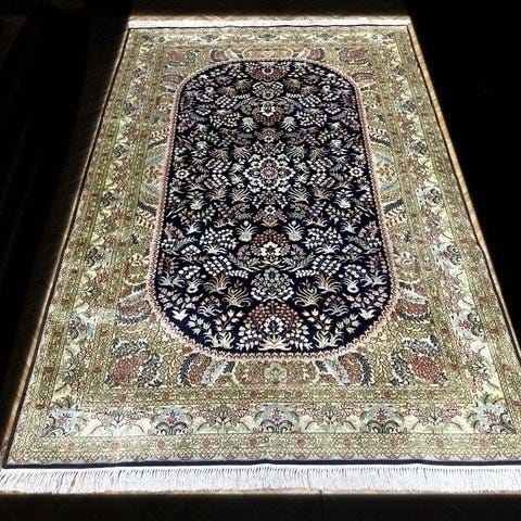 Højt klasset og ekstraordinær skønhed, originalt og eksklusivt silketæppe Ghoum håndvævet og lavet af silke af højeste kvalitet på bomuld; konturerne fremhæves og fyldes med silketråd med en kortklippet, skinnende plys. Tæppet er bekræftet med et certifikat for kvalitet og oprindelse. Orientalsk design et imponerende medaillon omgivet af vidunderlige blomsterarrangementer og harmonisk kontrasterende farver gør det meget smukt og værdigt at se, når det udlægges.