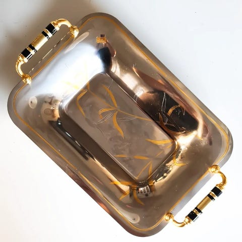 Giorinox-bakke i rustfrit stål 18/10 med 24 kt guldfinish, målene 53x34 cm, spejlpoleret overflade, til servering af drikkevarer, bagværk og til eftermiddags-te osv. Egnet til både hjemmet og renovering. Fremragende stand.