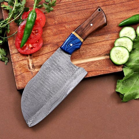 Håndtaget præsenterer et markant rødt og sort marmoreret design, udformet til både visuel appel og ergonomisk komfort. Fastgjort med polerede messingpinde, giver håndtaget et solidt, afbalanceret greb, der reducerer håndtræthed ved længere tids brug. Med funktionalitet kombineret med markant stil er dette kniv et pålideligt og iøjnefaldende bidrag til enhver kulinarisk opsætning,