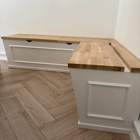 Fodlisten bliver bygget ind i bænken så den går helt ind til væggen. Bænken er med vippelåg og med valgfri ruminddeling.