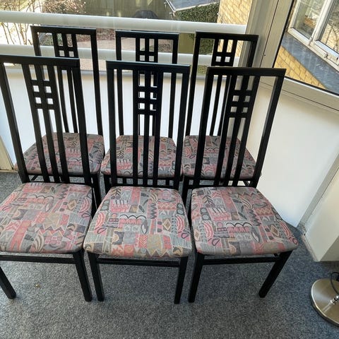 6 spisebordsstole som man sidder rigtig godt i. Højde på armlæn er 62 cm