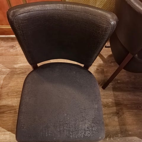 Stol i træ med sort polstret sæde. Ryggen er udført med lodrette sprosser, og stellet er i mørkbejdset træ. Sædet er let buet og betrukket med sort kunstlæder eller lignende materiale. Egnet til Café/Restaurant.
