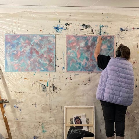 Abstrakt maleri sæt bestående af flere mindre lærreder. Motiverne er malet i en løs, ekspressiv stil med overvejende varme farver som orange, gul, rosa og brun kombineret med blå og hvide nuancer. Malerierne er udført på lærred og enkelte er indrammet i lyse trærammer. Egnet som vægdekoration i stue, gang eller kontor, hvor der ønskes et farverigt, abstrakt udtryk.