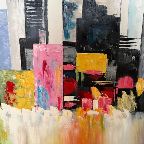 Maleri med bymotiv udført af ukendt kunstner. Købt i Ilva. Motivet viser en gade med høje bygninger i stærke blå og gule nuancer. Billedet er malet på lærred og kan hænges direkte på væggen. Velegnet som vægdekoration i stue, kontor eller andre opholdsrum, hvor et moderne bymotiv ønskes.