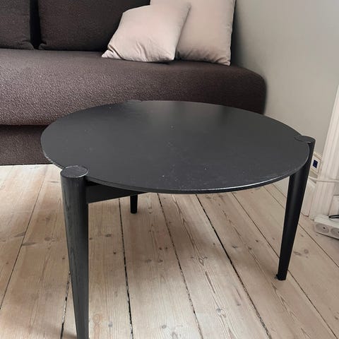 Sofabord Jet sort, ø 70 cm, (sortmalet eg) med nogen patina/brugsspor og lille sidebord ell skammel i eg... er næsten som nyt.