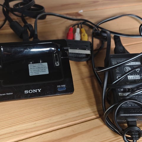 Sony Handycam videokamera i sølvfarve. Kameraet er et kompakt håndholdt videokamera med udfoldelig LCD-skærm i siden til visning og menuindstillinger. Det har håndrem med Sony-logo for bedre greb ved optagelse. Velegnet til optagelse af video i hjemmet, på rejser eller ved arrangementer. Under bunden er der gevind til montering på stativ. Kameraet bruger optagemedie i siden bag LCD-skærmen (for eksempel disk eller lignende, afhængigt af den specifikke model).