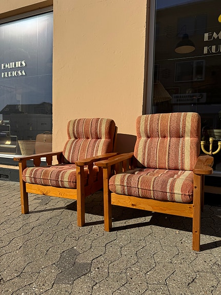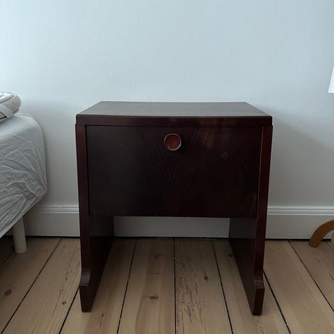 To sengeborde i lakeret fyrretræ med skuffe og skab. Bordene er et sæt, så lågerne åbner modsat.