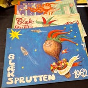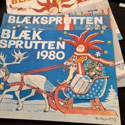 Blæksprutten årsblade fra 1956-1983. Tegneserieblade med satirisk indhold og illustrationer. Samlet sæt af 28 numre, hver med forskelligt omslag og indhold relateret til årstallet. Blæksprutten er Danmarks ældste og sjoveste årshæfte.