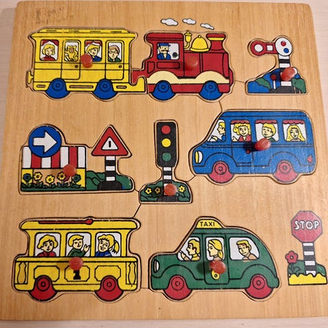 Træpuslespil med polititema og knopper. Brættet viser forskellige politiscener, blandt andet politibil, motorcykelbetjent og betjent i arbejde. Brikkerne er udskåret i kraftigt træ og har små plastknopper, som gør det lettere for barnet at få fat i dem. Egnet som motorik- og formgenkendelsestræning for mindre børn.