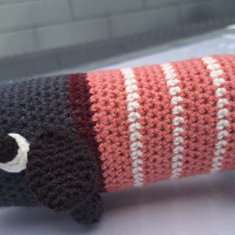 Hæklet panda bamse i sort og hvidt garn. Bamsen er formet som en panda med store øjne, runde ører og broderet snude og mund. Den har en hvid sløjfe om halsen og holder et lyserødt hæklet hjerte i den ene pote. Bamsen er blød og fyldt, egnet som krammebamse eller pynt