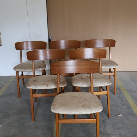 Seks smukke Farstrup model 210 udført i teaktræ. Alle med ny skai på sæderne. Sælges samlet.