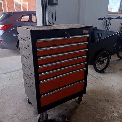 Toppen har en sort overflade, der kan bruges som arbejds- eller afsætningsplads. Skufferne er velegnede til opbevaring af værktøj og tilbehør i værksted, garage eller hobbyrum.