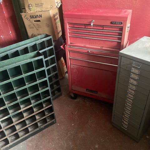 Værkstedsvogn med 5 skuffer på hjul i rød metal.