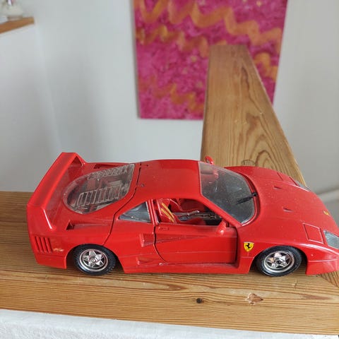 Ferrari cabriolet modelbil i rød farve. Modellen forestiller en klassisk åben sportsvogn med to sæder, detaljeret interiør med rat og instrumentbræt samt åbne døre. Bilen har kromfarvede fælge, udstødningsrør bagtil og små Ferrari-logoer på siderne. Velegnet som legetøj eller som samlermodel til udstilling på hylde eller i montre.