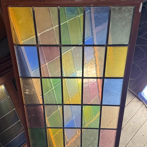 Glas fra blyindfattede vinduer sælges. Glassene er gamle.