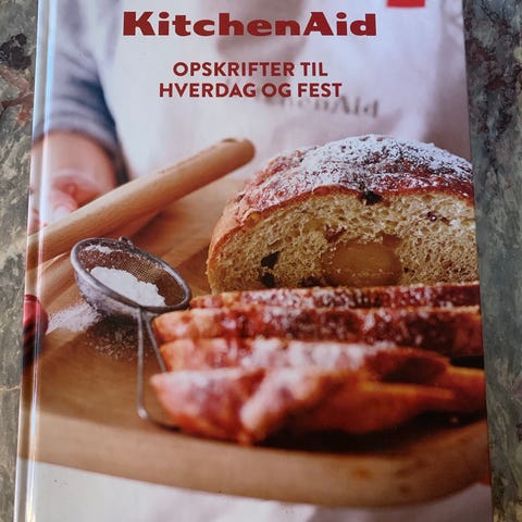 KitchenAid kogebog med opskrifter til hverdag og fest. Bogen indeholder forskellige bage- og madopskrifter, herunder brød, kager og retter til både dagligdage og særlige lejligheder. Illustrationer og fotos viser brug af KitchenAid køkkenmaskine og tilbehør i madlavningen. Velegnet som inspirationsbog til bagning og madlavning i hjemmekøkkenet.