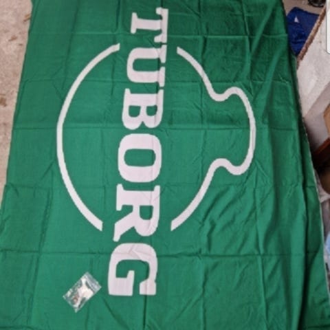 Tuborg flag i grøn med store hvide bogstaver langs hele flagets længde. Flaget har hvid kant i siden med plastkroge til ophæng i flagstang eller lignende. Egnet til dekoration, events eller brug i forbindelse med Tuborg-relaterede arrangementer.