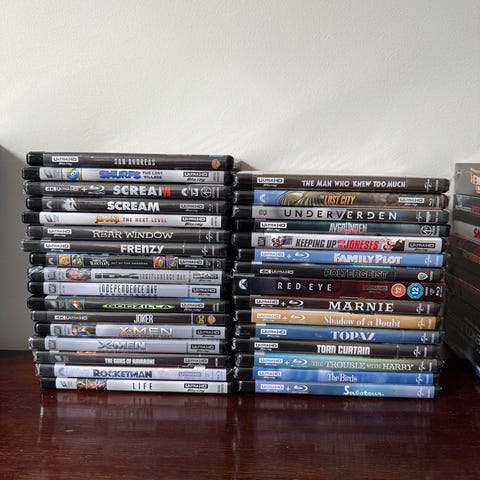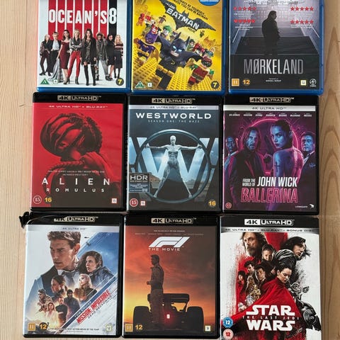 Filmene er i originale plastcovers med trykt omslag. Bagsiderne viser tekniske specifikationer som billedformat, lydformater, undertekster og aldersgrænser, som kan aflæses direkte på billederne. Velegnet til afspilning på kompatible Blu-ray og 4K Ultra HD Blu-ray afspillere.
