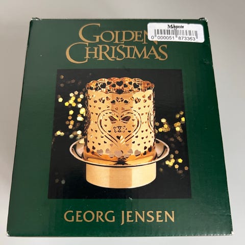 Georg Jensen julepynt lysestage i kombination af guldfarvet metal og klart glas. Lysestagen har en kroneformet holder i metal med indsats i glas til fyrfadslys eller lille lys. Egnet som borddekoration eller vinduespynt i juletiden. Designet til indendørs brug og kan indgå sammen med andet klassisk julepynt fra Georg Jensen.