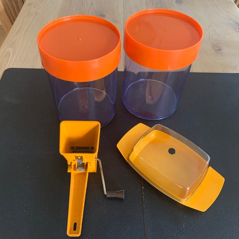 BOKSE, RETRO, REN RETRO FRA CA 1970 .. DER ER 9 FIREKANTET OPBEVARINGSBOKSE .. EN HØJ .. 6 RØDE KURVE .. 2 RUNDE DÅSER .. 2 GLAS MED RØDT LÅG .. 5 RØDE SKEER OG 3 ANDER SKEER … ALT PÆNT RENT VELHOLDT .. DET ENE LÅG PÅ BOKSENE HAR ET HAK PÅ 5 mm .. BOKSENE MÅLER 10x10 CM OG ER 16 CM HØJE