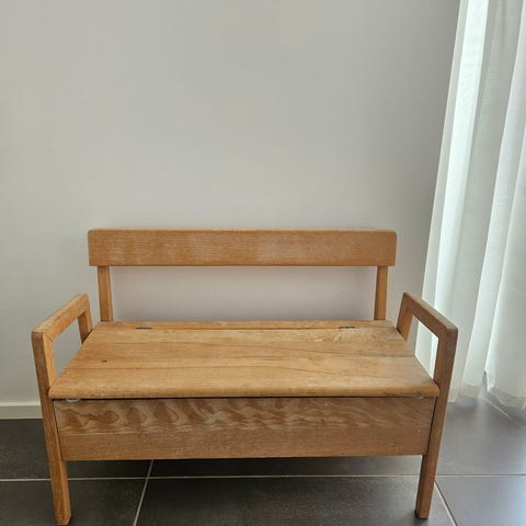 Bænken har ryglæn og armlæn samt et sædelåg, der kan løftes op, så der er adgang til et opbevaringsrum i hele bænkens længde. Velegnet som siddeplads og opbevaring i fx entré, gang eller værelse.