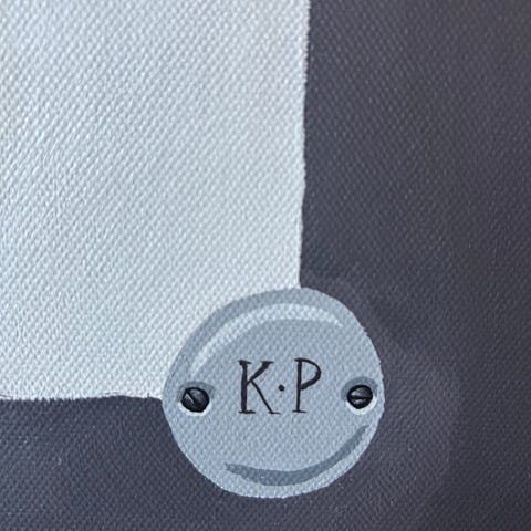 KP maleri på lærred med motiv af kaktus i potte. Billedet viser en stiliseret kaktus med runde grønne segmenter i en lerpotte på lys baggrund indrammet af en mørk kant. Kunstnerens initialer KP fremgår i nederste hjørne. Velegnet som vægdekoration i f.eks. stue, køkken eller kontor.