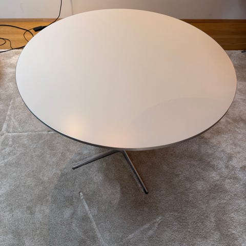 Fritz Hansen Arne Jacobsen A603 bord med rundt hvidt bordplade og alukant samt krom stel. Bordet er i rigtig pæn stand uden ridser eller hakker. Nypris 15.000.-