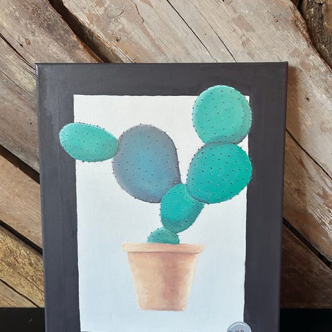 KP maleri på lærred med motiv af kaktus i potte. Billedet har en hvid midterflade med kaktusmotiv og en grå kant rundt om. Signeret med initialerne K.P. Nederst i hjørnet er der en rund plade med K.P.-mærke. Velegnet som vægdekoration i stue, soveværelse eller andre opholdsrum.