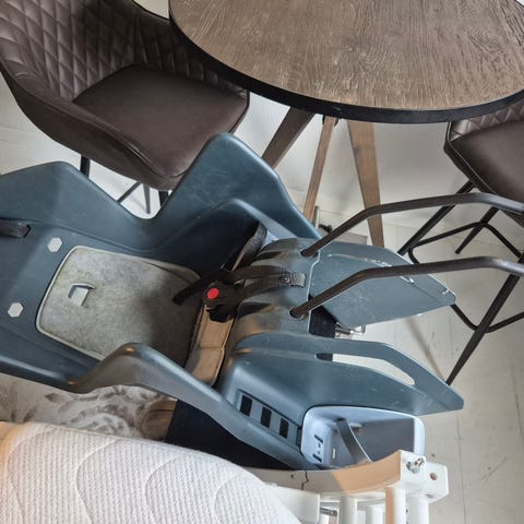 The locking system means extra security, as only an adult can unlock and change the position of the backrest. The bicycle seat has waterproof cushions on both the seat and the back. In addition it is equipped with adjustable footrests with a strap.