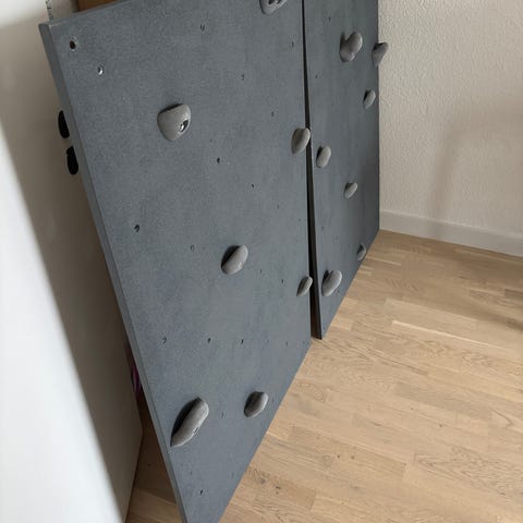 Jeg har fundet en god lokal klub, og sælger derfor hjemmevæggen. Den er 4,3x4,5 meter og der er 5 plader yderligere på 260x125cm - det er rigtige plader i 15mm birkekrydsfiner. Der er dertil to volumener, og en masse fine greb med bolte. Hvis du ikke er sart kan du få den gamle bogw madras med gratis. Den dækker hele bredden og har masser af fald i sig endnu.. sælges uden ramme/skelet.
