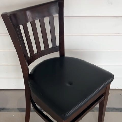 Polstret spisestol i sort betræk med let buet ryg og sæde. Stolen har ben og stel i træ med mørk finish. Egnet som spisebordsstol eller ekstra siddeplads i stue, køkken eller café-lignende miljø.