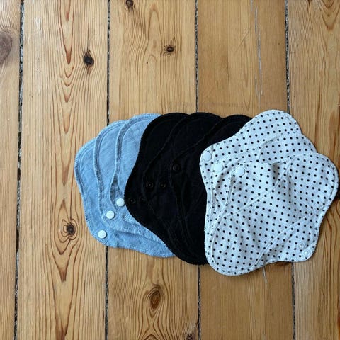 Genanvendelige stofbind i forskellige størrelser og former. Bindene er fremstillet i blødt stofmateriale med knaplukning i vingerne til fastgørelse omkring trussekanten. Sættet indeholder både ensfarvede og mønstrede bind i flere farver, herunder rosa, brun, grå, sort og flerfarvede mønstre. Egnet til menstruation eller let inkontinens for kvinder, hvor der ønskes et vaskbart og genanvendeligt alternativ til engangsbind.