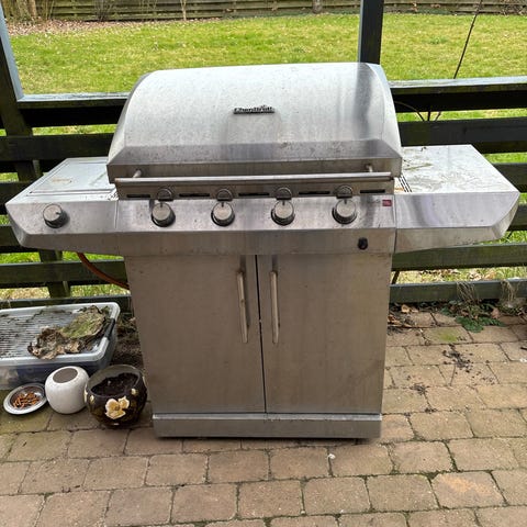 Z BBQ gasgrill i rustfrit stål. Grillen har 6 hovedbrændere på fronten med individuelle betjeningsknapper samt integreret termometer i låget. Der er stor grillrist og ekstra varmholdningsrist øverst. I siden er der en separat sidebrænder med låg til tilberedning i gryde eller pande. Under grillen findes skab med låger til opbevaring af gasflaske og tilbehør. Velegnet til udendørs madlavning på terrasse eller i have.total længde 170 cm stege flade 95 x 50 cm. Brugt meget lidt. Overtræk medfølger men revnet