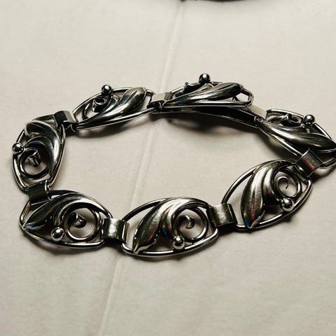 Fint sølv armbånd i meget fin stand fra den københavnske sølv- og guldsmed John Lauritzen(var aktiv i årene 1955-81). Stemplet i låsen som ses på billede: JL 830S (830 som bl.a. tretårnet sølv også er stemplet med).