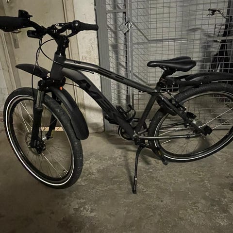 Principia Evoke AZ.6 børnecykel med 26" hjul. Cyklen er gul med sorte detaljer og er udstyret med forgaffel med affjedring, gear og bremser, Der er monteret skærme for og bag, helt nye dæk samt lås med tilhørende nøgler (2 stk)