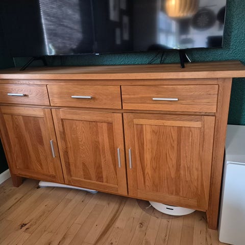 Stor skænk i massiv træ med 3 skuffer og 3 skabe.