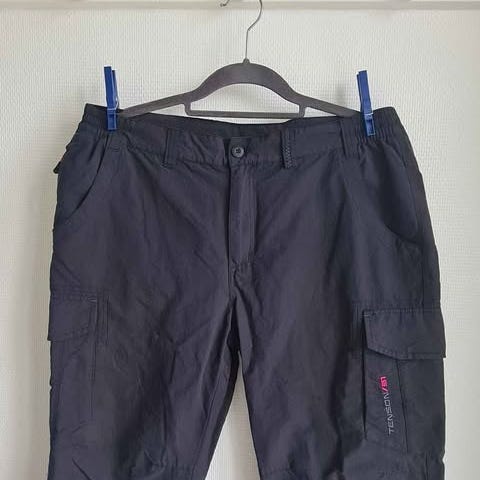 Dame fritids--/ vandrebukser i grå polyester - zipp Off model, størrelse 42. Bukserne har lynlås og knaplukning foran samt bæltestropper i linningen. Buksen har flere lommer, herunder en indvendig Security pocket. Materialet er let og glat polyester - hurtigtørende. Buketterne sælges billigt, da knaphullet skal repareres og der er et lille “skred” ved linningen - se billedet.