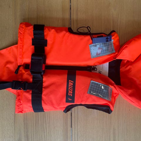 Baltic redningsvest til baby/børn op til 15 kg. Vesten er orange med hætte, reflekser på skuldrene og justerbar rem omkring livet. Den har lynlås foran, bæltespænde og skridtrem for bedre pasform. Har selv brugt den få gange til baby på 9 mdr som vejede ca. 9 kg.