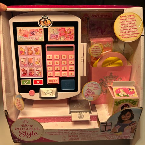 Gør indkøbslegen magisk med Disney Princess Self Check Out Cash Register! Med ægte infrarød scanner, lys og lyde kan børn scanne, veje og betale som i en rigtig butik.