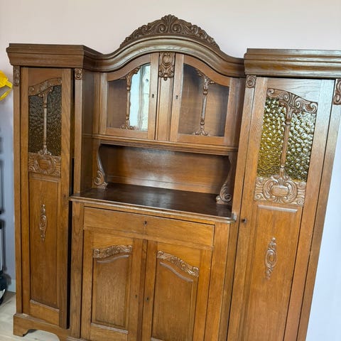 Smukt gammelt skab - med pænt spejl og smukke låger. Indeholder 5 hylder og en stor skuffe underst.