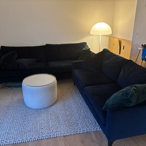Fin og velholdt sofa i modellen Astha 3 seater. Messing ben og mørkegrå velour betræk. "Slank" model., som også er udmærket at sove på. Fra hjem uden røg og dyr. Nypris 7999 kr.