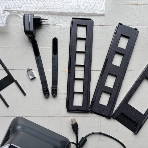 Medfølgende tilbehør omfatter diasbakke, negativbakke, filmholder til 35mm film, renseværktøj, software-cd, USB-kabel og quick start-guide. Scannerens kompakte design gør den egnet til bordbrug ved digitalisering af ældre 35mm billedmateriale.