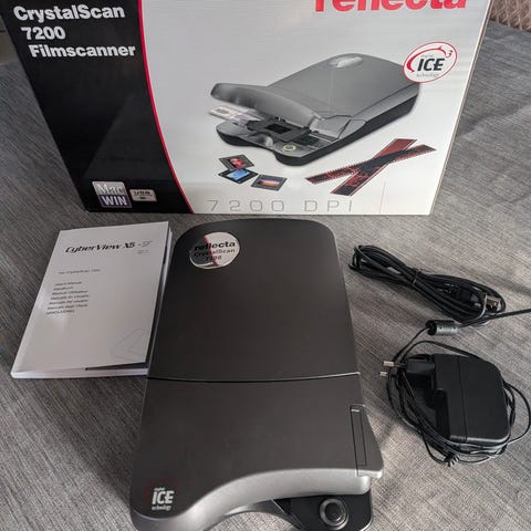 Plustek Smartphoto F50 fotoscanner, til både negativer og dias, med slæde til dias og til negativer, cd-rom med driver og software, usb-kabel og manual.