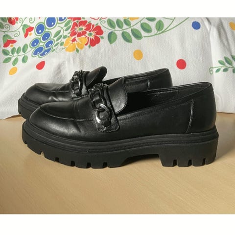 Marquiiz loafers i str. 41. Skoene er i en beige farve med kraftig, rillet sål og klassisk penny-loafer detalje over vristen. Overdel og sål er i et glat materiale med synlige stikninger langs kanten. Velegnet som hverdagssko eller til mere pænt brug. Ingen yderligere specifikationer om materiale eller pasform oplyst.