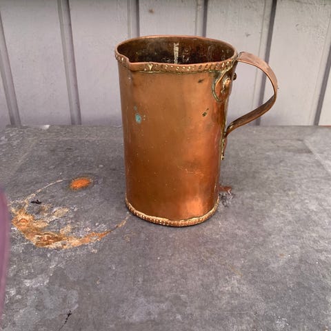 Kobberkande har buet hank og tud formet med dekorative detaljer. Højden fremgår af billedet med målebånd, ligesom diameteren kan ses på det vandrette målebånd. Egnet som dekoration eller til brug, afhængigt af stand og behov. Klassisk kobberudtryk med synlige brugsspor, som kan ses på billederne.