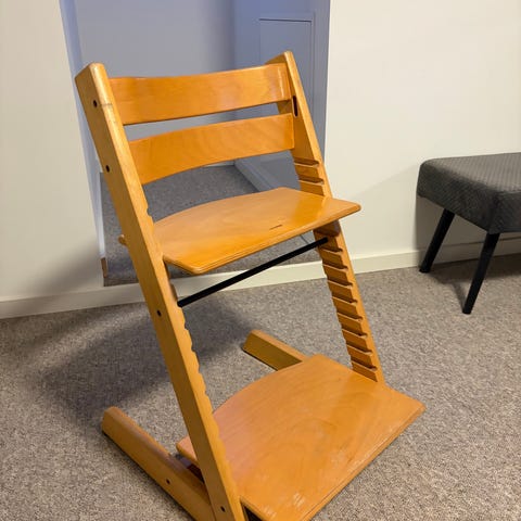 Stokke Tripp Trapp højstol i naturfarvet træ. Klassisk justerbar højstol med regulerbart sæde og fodplade, der kan tilpasses barnets højde. Egnet til brug ved spisebord eller som siddeplads til børn i forskellige aldre. Fremstillet i træ med tværstænger for stabilitet.