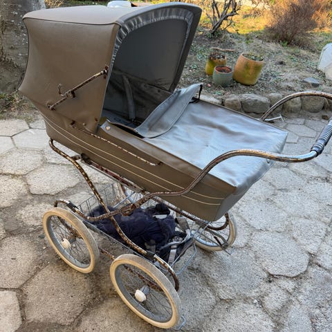 Ældre, godt brugt barnevogn. Brugt som ekstra barnevogn. Stået inde i carportrum. Har lidt rust på stellet. Inderforret er lidt mørnet på bagsiden og smuldrede lidt ved vask. Er sat i vognen og sidder fint. Der medfølger madras, som ikke er lige så gammel som vognen. Medfølger også myggenet, dette er der dog nogle huller i. Købt brugt.